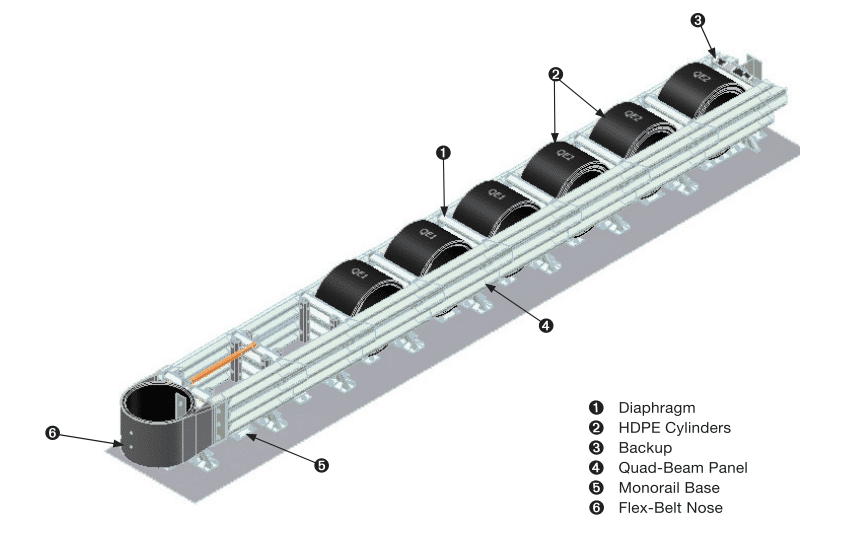 The QuadGuard® Elite is a redirective, non-gating crash cushion. The system is tested to NCHRP Report 350 Test Level 2 and Test Level 3. The cylinders are made of High Density Polyethylene (HDPE) and are potentially reusable after an impact within NCHRP Report 350 crash test standards.