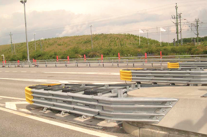 The QuadGuard® is a redirective, non-gating crash cushion that consists of crushable, energy absorbing cartridges surrounded by a framework of steel Quad-Beam™ panels. The system is tested to NCHRP Report 350 Test Level 1, Test Level 2, and Test Level 3. It can be used to shield fixed objects of 2′ to 10′-6″ wide (610 mm to 3,200 mm) while using less than 22′ in length. Higher speed QuadGuard® crash cushion units are available.