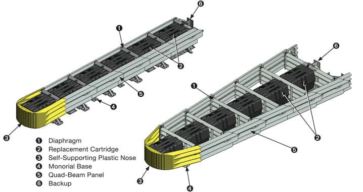 The QuadGuard® is a redirective, non-gating crash cushion that consists of crushable, energy absorbing cartridges surrounded by a framework of steel Quad-Beam™ panels. The system is tested to NCHRP Report 350 Test Level 1, Test Level 2, and Test Level 3.