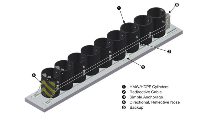 The REACT 350® is a redirective, non-gating crash cushion that consists of High Molecular Weight/High Density Polyethylene (HMW/HDPE) cylinders. It is tested to NCHRP Report 350 Test Level 1, Test Level 2, and Test Level 3.